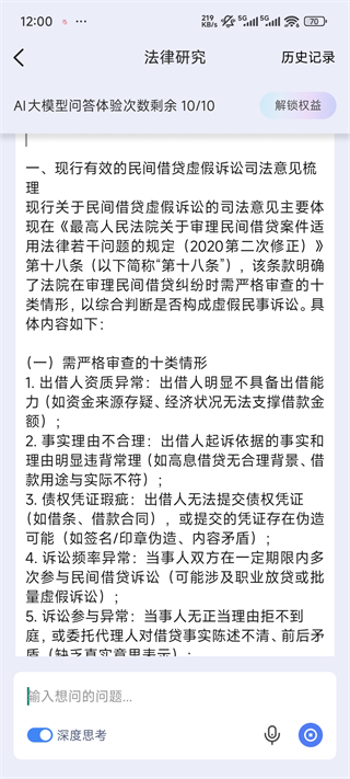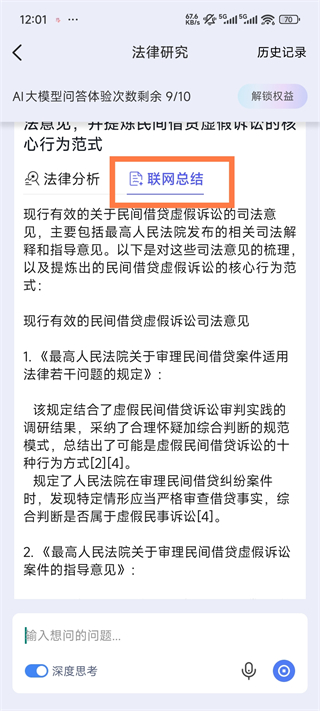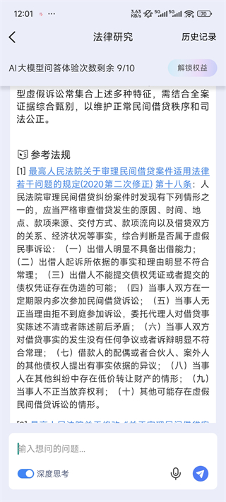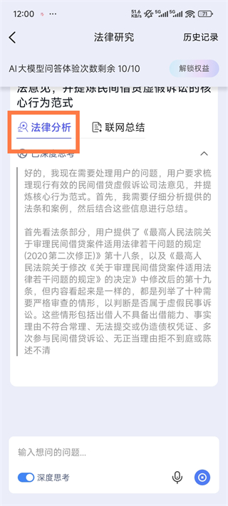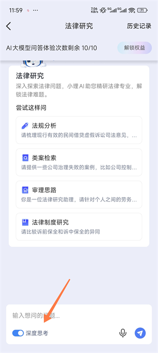 在进入法律研究界面后,打开左下角的“深度思考”开关,在对话框输入想要研究的法律问题,点击发送,即可进入法律问题分析与结果生成界面。